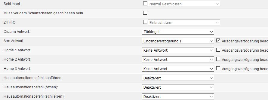 Danke für eure schnelle Antwort. Ich habe es gefunden. Ich habe den Türsensor jetzt so wie im Bild eingestellt. Ist das so richtig? Alle anderen Fensterkontakte stelle ich dann alles auf "keine Antwort", die sollen ja sofort reagieren. Ist das ok?