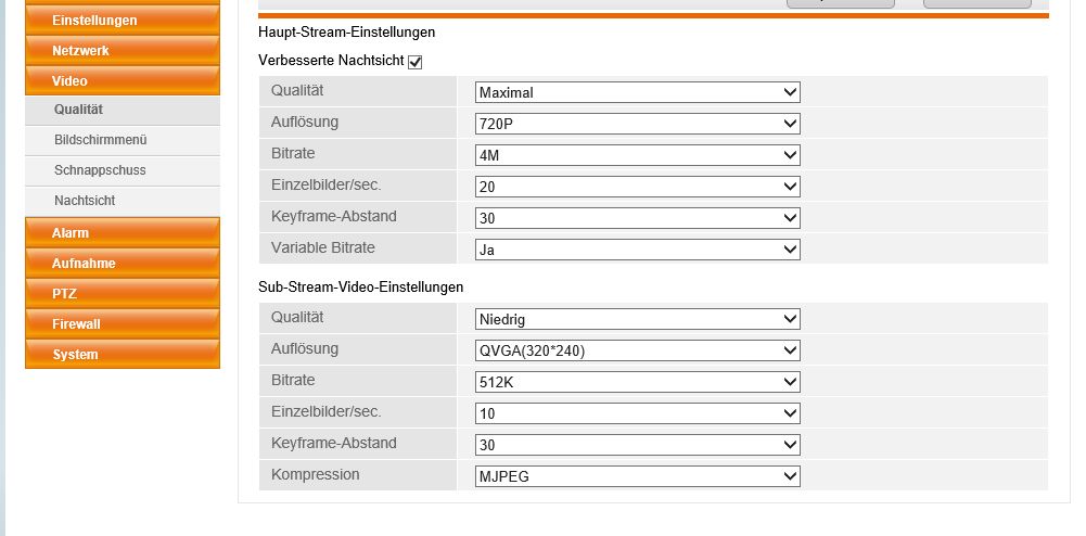 unter Video Qualität: Sub Stream Video-Einstellung auf MJPEG einstellen anstatt 264