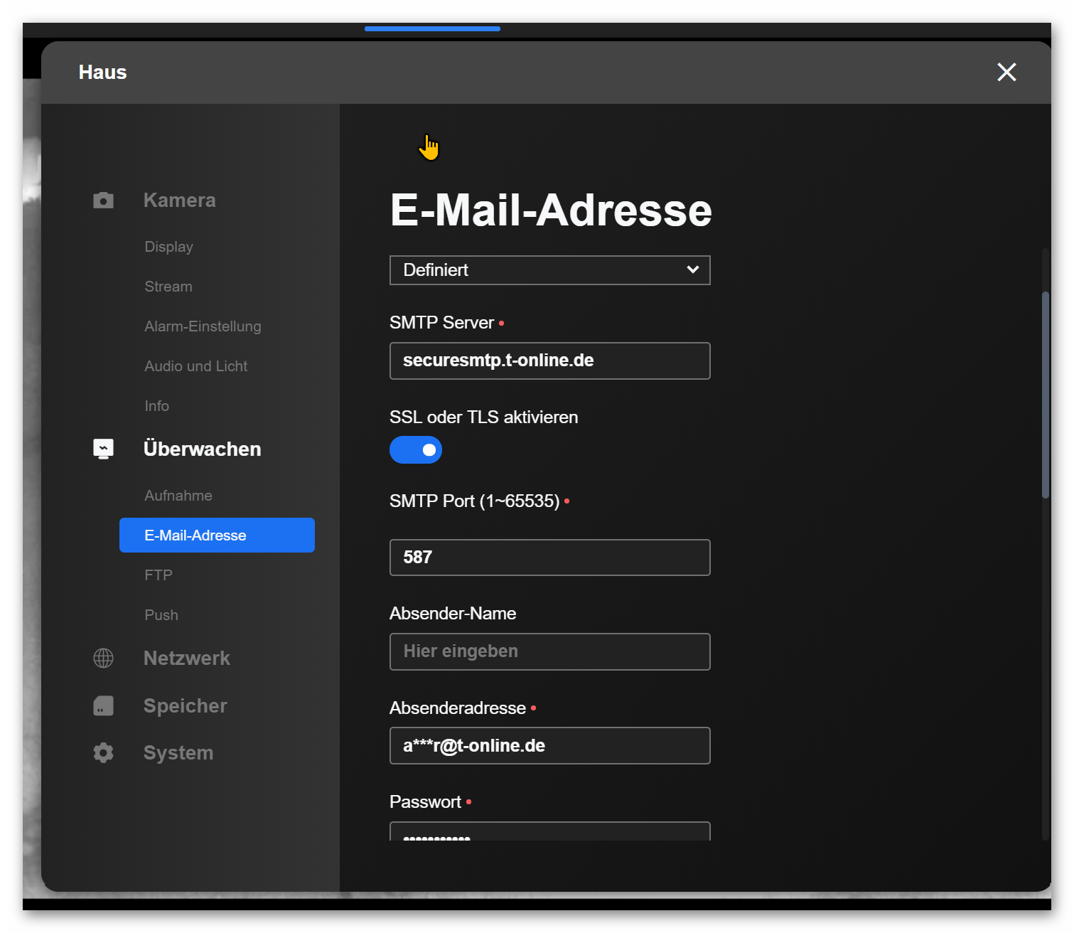 Jetzt möchte ich aber ,wenn ich in der Ferne bin , mein Grundstück über die E-Mail-Adresse überwachen. Neben mir wurde ein Garten zum Parkplatz umgebaut . Da hat nun jeder Zutritt. Möchte aber nur mein Haus von hinten beobachten. Jetzt bleibe ich bei der Einrichtung der E-Mail-Adresse hängen . was ich dort eingebe ist alles nicht richtig , Beim Test kommt die Fehlermeldung 400. Was ich schon erlesen habe , die T-online Mail geht wohl nicht. Ich schreibe mal , wo ich nicht weis ,was kommt dort reingeschrieben. SMTP Server ist mit drei Mailserver angegeben . Bei G-Mail habe ich schon einen Zugangs Adresse. 2.) Dann kommt der Kasten für SMTP Server -- was kommt hier rein? 3.)SSL oder TLS aktivieren .. ja oder nein.? 4.) SMT Port ..... was kommt hier rein ? Jetzt habe ich enorme Probleme a.) Absender Name - was kommt hier ..rein b.) Absender Adresse .... was kommt hier rein c.)Passwort ...... ?????? d.) Empfänger Adresse ......von wem . Danke , bitte wer kann mir helfen. vielleicht bitte mal an Hand von g- Mail ausfüllen . Danke , [attachment=4638][attachment=4638][attachment=4638][attachment=4638] |