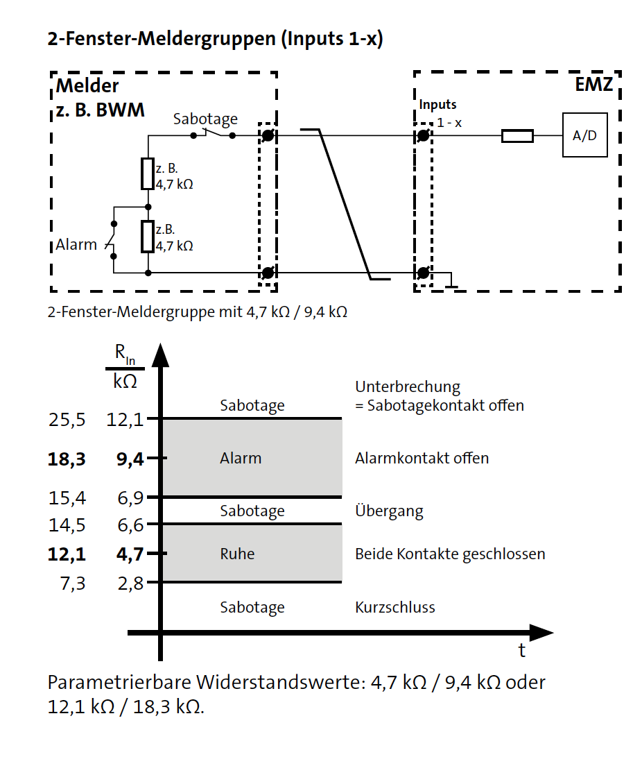 Aktuell hast du ja scheinbar keine Differenzierung zwischen Überfall und Sabotage der Taster. Wenn du auf die Sabotage verzichten kannst und willst, kannst du einfach die Leitung reparieren und die 12k1 drin lassen. Telenot frisst das auch. Nachträglich eine Mehrmelderlinie auf DEOL (2EOL, Zwei-Fenster-Meldelinie, verbindungsüberwachte Meldelinie, ...) umrüsten macht keinen Spaß und benötigt mehr als zwei Adern. Hab mir mal von Google ein Bild ausgeliehen, die Widerstandswerte passen aber nicht: |