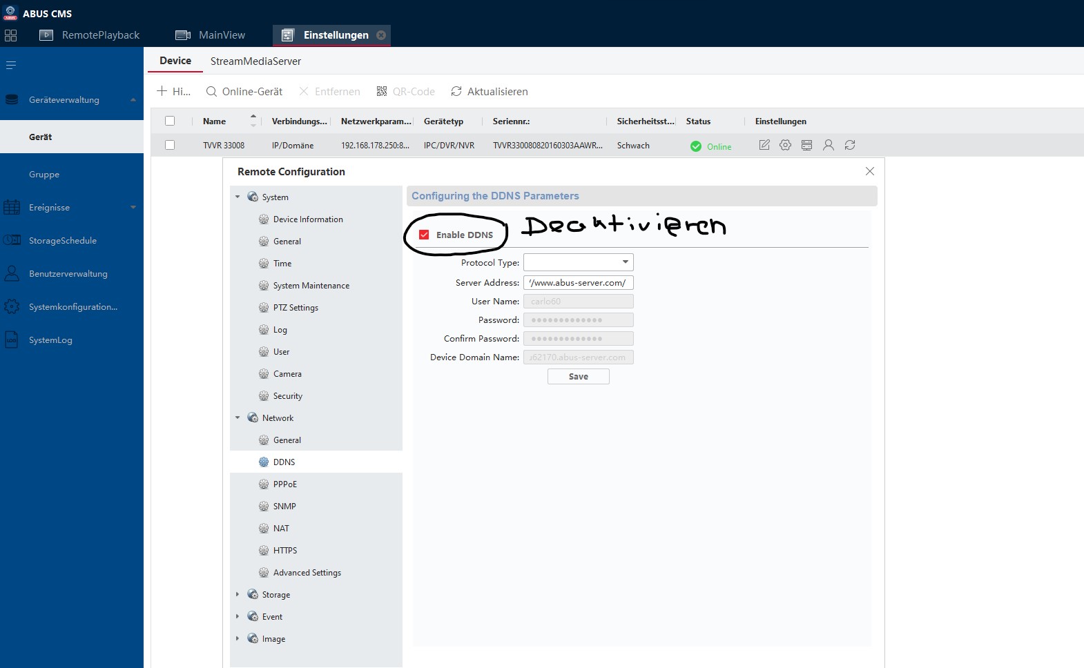vorab vielen Dank :-) irgendwie will es nicht so klappen, was meinst du mit Cam die CMS Software von Abus wo ich vom PC Einrichten kann? was habe ich gemacht: - DDNS in ABUS CAM deaktivieren. - MYFritz in Fritzbox einrichten - Ports der Cam in fritzBox freigeben (z.B. 37777 auf 10000) - In App die MYFritz Adresse mit Doppelpunkt 10000 eintragen (z.B. ich.myfritz.net:10000) |