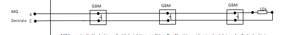 Die Anschlüsse sind parallel. Der Glasbruchsensor ist nicht in Reihe mit den anderen GBS, wie bei Reedkontakten. Die GBS sind alle parallel geschaltet und schließen die Linie kurz bei Auslösung.