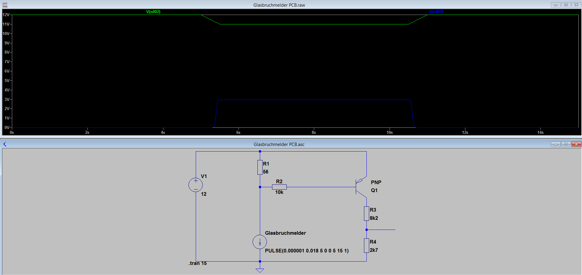 Da ich aber bei beiden gekauften GBM keinerlei Spannungseinbruch beim Auslösevorgang beobachten konnte und ich die gleiche Schließer-Funktionalität wie bei den bereits in der Wand verbauten GBM10 haben wollte, habe ich mir schnell eine Adapterschaltung überlegt. Die Berechnung hat 2min benötigt, die Bauteile kosten ca. 1,50 Euro. Für alle die es interessiert und evtl. anpassen wollen : Stromaufnahme des GBM im Ruhezustand : < 1µA Stromaufnahme des GBM im Alarmzustand (LED an) : ca. 18mA Vorwiderstand in die 12V Seite des GBM : 1V/18mA = 56Ohm Basisvorwiderstand PNP-Transistor : 10kOhm es soll später am Eingang der Alarmanlage 8k2/2k7-Spannungsteiler eingebaut werden, damit der ADC vom Cortex M7 max. 3V sieht mit 10k Basisvorwiderstand führt die Stromüberhöhung zum Durchschalten des Transistors bis zur Sättigungsrestspannung von ca. 0,2V Das Berechnen hat 2min gedauert, das Raussuchen der Teile, Arbeitsplatz einrichten und Aufbauen ca. 1h Die Mechanik (Gehäuse suchen, Öffnungen bohren, Pfosten einkleben, etc.) mehrere Stunden XD Der Meldegruppeneingang wurde mit den 12V verbunden, normalerweise liegen dort die 12V der Meldegruppe an. Habe vorher zum Spaß das ganze noch mal mit LTSpice simuliert und anschließend die Schaltung mit dem Oszi an den gleichen Stellen (am Basisvorwiderstand und am offenen Kollektor) gemessen. Der gelbe Plot ist die Spannung am Basisvorwiderstand und sinkt von 12,1V auf ca. 11,2V ab, der pinke Plot ist auf Ausgang (in diesem Fall offener Kollektor) und geht fast auf die vollen 12,1V die angelegen haben an der Versorgung. Bei anderen Versorgungsströmen kann durch geänderten Vorwiderstand (statt 56 Ohm) dieser leicht angepasst werden. Das Käschtele ist so klein 40mm Kantenlänge, dass ich es in die 50mm Unterputzdose noch unsichtbar verbauen kann