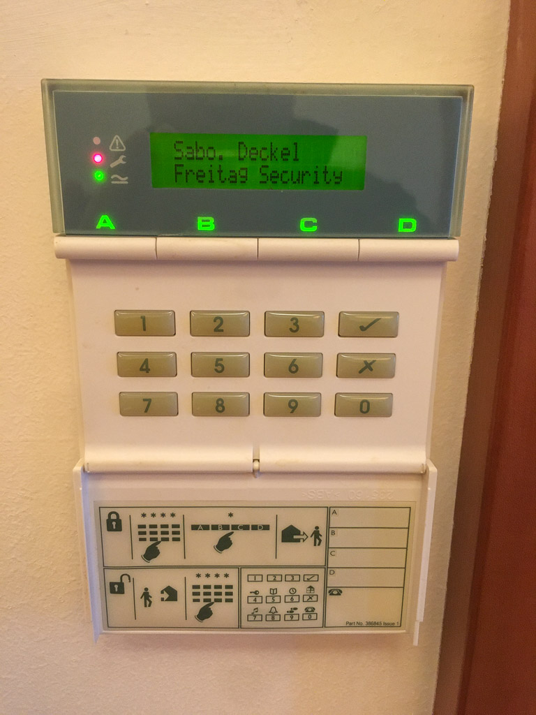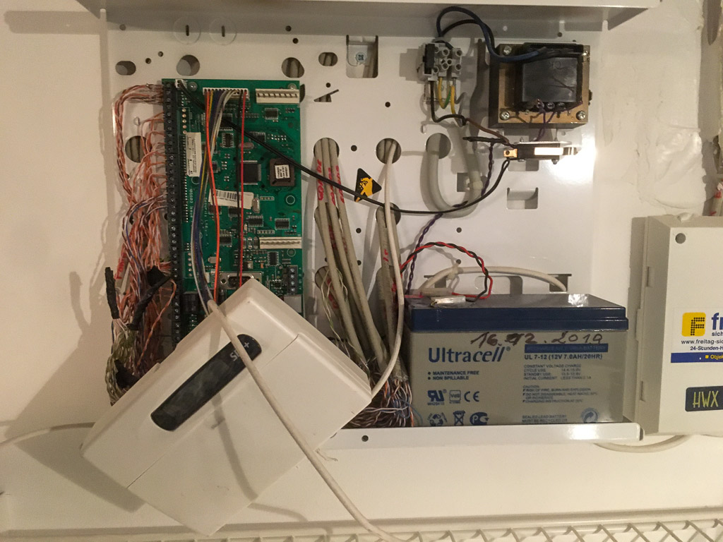 Ich bin kürzlich zu meiner Frau in ihr Haus gezogen, in dem eine Alarmanlage verbaut ist. Leider gibt es dazu aber keine Dokumentation mehr, und die Firma die vor 15 Jahren die Installation gemacht hat gibt es auch nicht mehr. Kann hier vielleicht jemand bei der Identifikation des Herstellers und Modells er Alarmanlage helfen? Leider habe ich unvorsichtigerweise den abgebildeten Kasten geöffnet, jetzt meldet die Anlage einen Sabotageversuch und braucht ein Reset, mir ist aber nicht klar wie das geht. Kann vielleicht auch hier jemand helfen? |