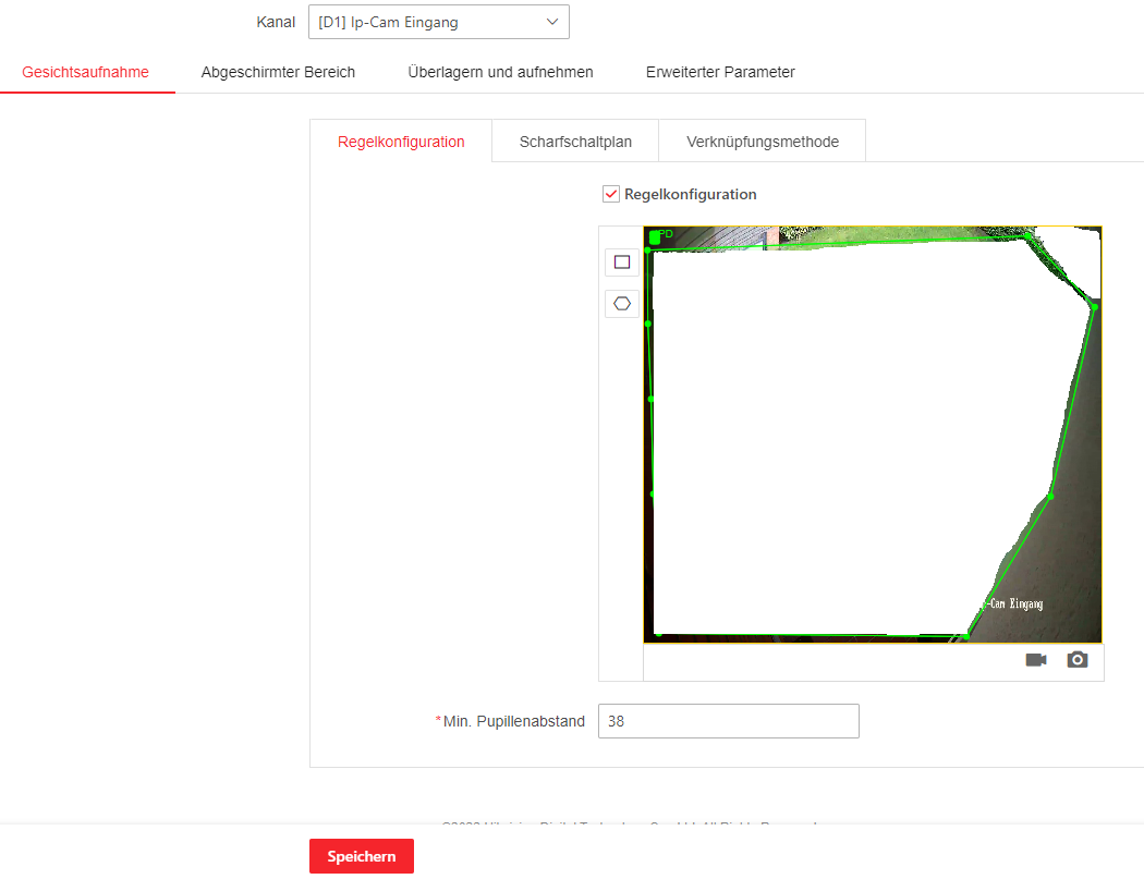 Unter VCA -> Gesichtsaufnahme im Menü des NVR habe ich unter Regelkonfiguration den Bereich gezeichnet (min. Pupillenabstand 38), Scharfschaltplan auf dauerhaft und Verknüpfungsmethode -> Notrufzentrale benachrichtigen ist aktiviert.
