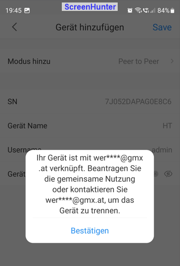 wenn ich diese auf dem Handy mit der App DMSS per Onlinesuche einbinden möchte, dann findet er die Kamera, aber nach eingabe der erforderlichen Daten (Name, User, PW) meldet mir das Programm, dass dieses gerät bereits mit xyz verknüpft ist und ich eine gemeinsame Nutzung bentragen muss. bei dem verknüpften User handelt es sich um meine Emailadressse.