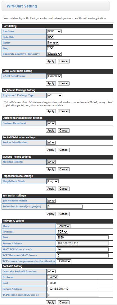 gesagt getan (siehe Anhang). Auch hier bekomme ich meine "xyz" Message zurück. Wenn ich sende kommt "no" zurück und die die Verbindung wird abgebrochen. Sehr unhöflich ;-) Die JA-121T wurde von meinem Alarmanlagen-Profi über Fernwartung installiert. Er hat diese jedoch noch nie implementiert, welche Parameter dort noch notwendig sind entzieht sich meiner Kenntnis. Könntest Du bitte mal über Wifi-Uart Settings d'rüberschauen (siehe Anhang), vielleicht stimmt dort was nicht. Mit "try and error" bin ich nicht weiter gekommen... Als DataTransfer Mode habe ich "transparent mode" eingestellt. LG Peter |