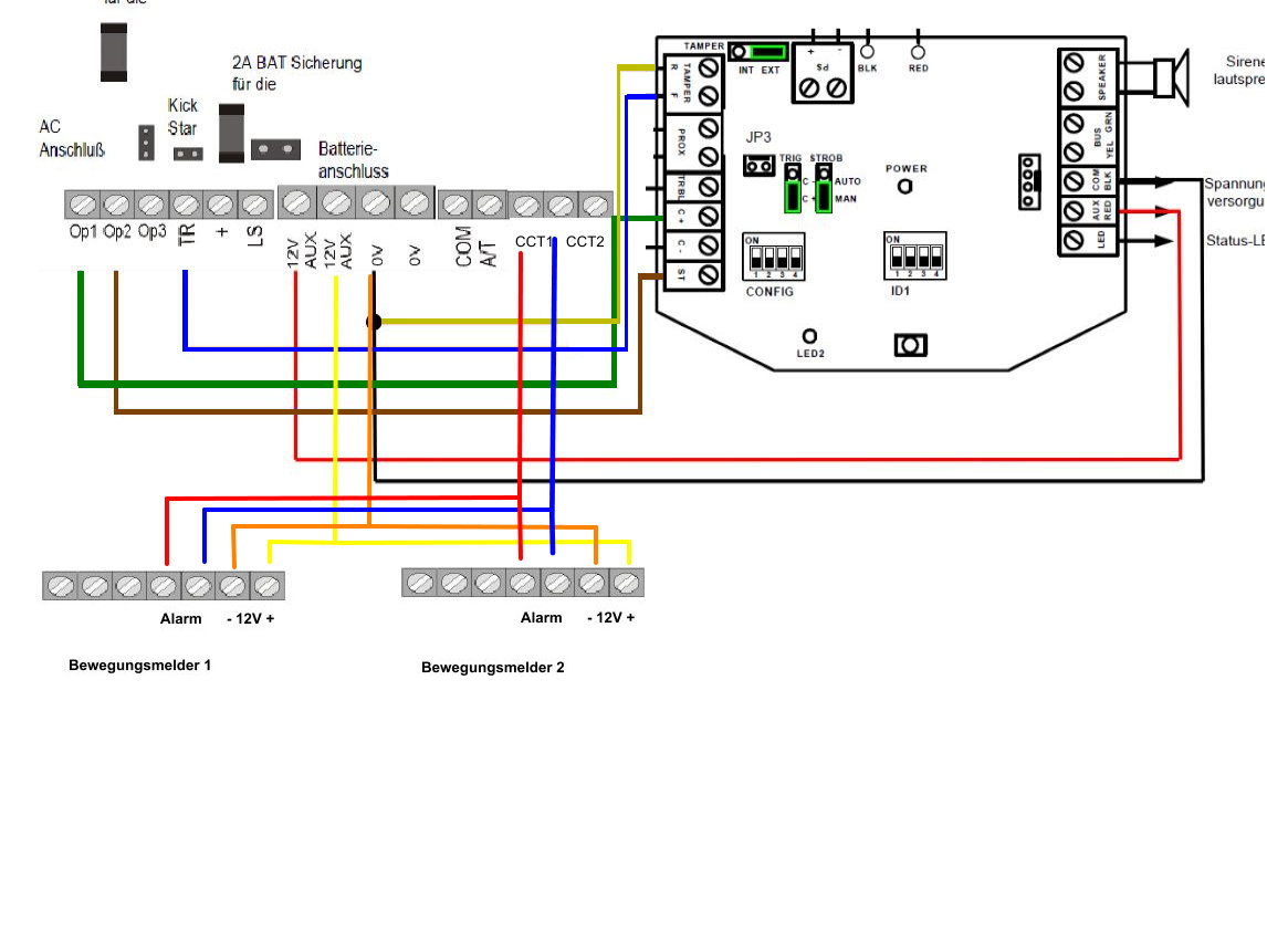 Habe es jetzt gestartet, und siehe da kein Sabotage mehr (man man ich könnt heulen vor Glück möchte mich nun an die Programmierung wagen, eine frage noch bevor ich anfange. Ich möchte nur 2 Bewegungsmelder mit dieser Anlage laufen lassen, diese habe ich zusammen in die steckplätze verbunden ist das okay? Oder müssen die in irgendeiner weiße versetzt in die Steckplätze? Ist wie auf dem Bild von mir zusehen ist alle verbindungen in ordnung?