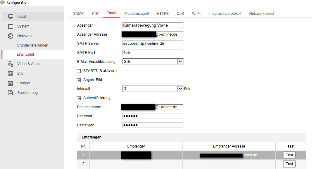 Ich hab die Tage mal versucht den meine t-online mail adresse in die Hiki IVMS-4200 einzubinden. In der iVMS-4200 Software unter System Configuration => dann Email. Da habe ich alle nötigen Daten eingetragen. Ergebniss : Send Test Email funktioniert.