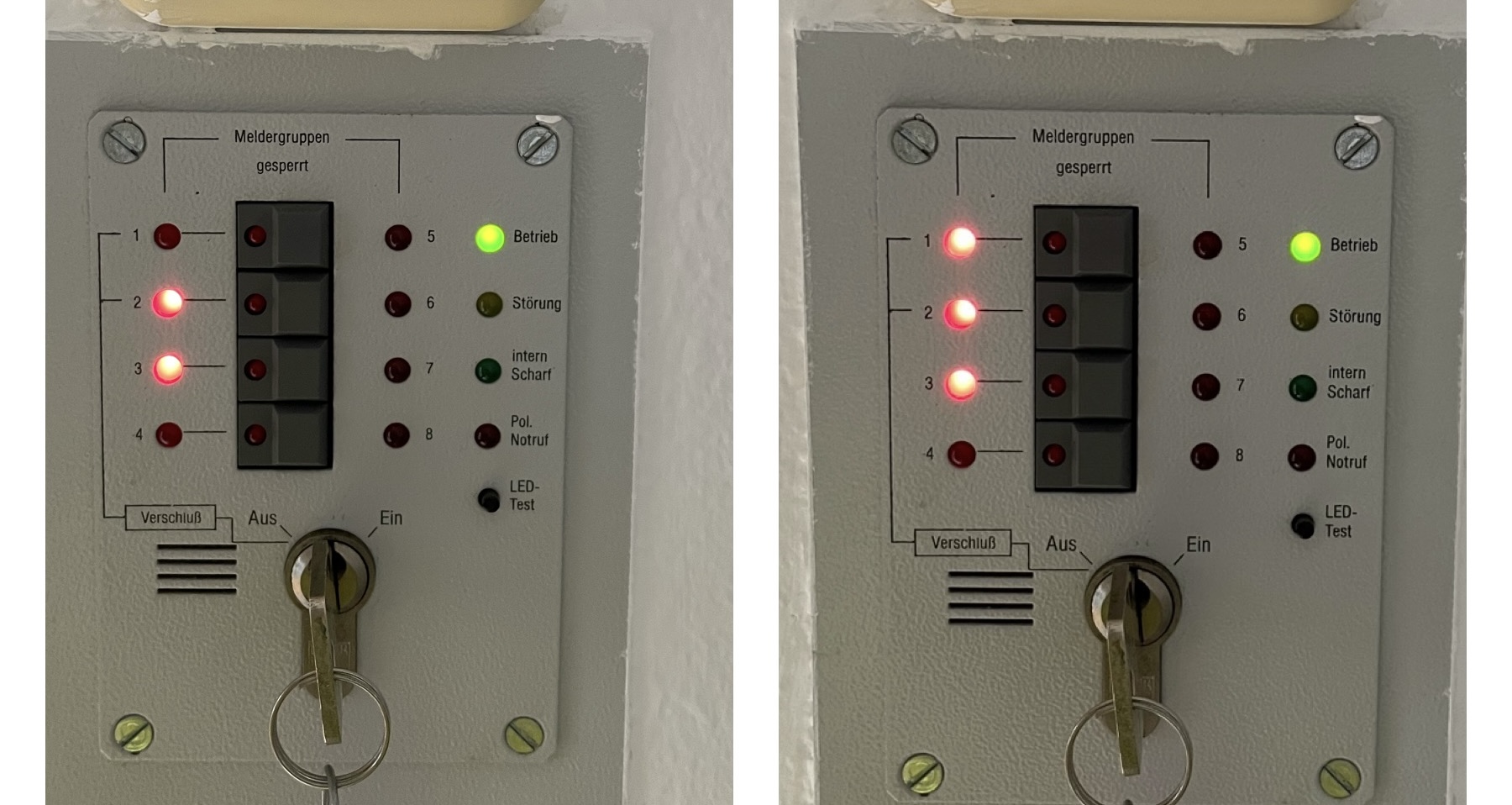 Habe unten den Reset gedrückt und dann oben den Schlüssel 8 Sekunden auf aus gehalten. Nach 3 Sekunden klickt es im Keller und alle LEDs linke Reihe (1-3) gehen kurzzeitig aus. Leider gehen aber dieselben Linken 3 LEDs nach erneuten klicken im Keller ohne für uns erkennbaren Zusammenhang immer wieder an. Was heißt das dass die linke Reihe 1-3 rot leuchtet ? Hier noch das Bild - ich glaube LED 1 hängt mit einem Bewegungsmelder zusammen. Kann man den irgendwie „ausschalten“ ? Oder is das normal dass der immer angeht und die LED 1 obwohl eigtl alles mit Schlüssel „ausgeschaltet“ wurde ? ------- EDIT: Unnötiges Vollzitat entfernt Ollik |