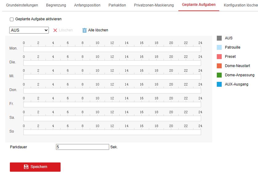 • In den PTZ-Einstellungen ist "Park Aktion" nicht aktiviert, "geplante Aufgaben" nicht aktiviert