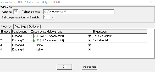 ich stehe gerade vor einem Problem, welches ich nicht gelöst bekomme. Projekt: Ein WLAN-Accesspoint ist in einem Gehäuse im Aussenbereich verbaut. Das Gehäuse und der Deckel sind über Kontakte überwacht. Der LAN-Port kann im Gebäude über einen potentialfreien Kontakt geschaltet werden (Abschaltung eines Switches). Die beiden Kontakte sowie der Ausgang sind an einem DUO I/O Modul 010130 angeschlossen. Es wurde eine Meldergruppe Typ Sabotagemeldergruppe angelegt. Siehe Screenshot. Das DIOM wurde wie folgt Konfiguriert. Siehe Screenshot SOLL-Zustand: Ich hätte gerne, dass wenn Eingang 1 oder Eingangs 2 auslöst: Ein Sabotagealarm wird gesetzt. Kein Hauptalarm wird ausgelöst. Ich bekomme eine SMS darüber <= Noch nicht programmiert. Der WLAN Accesspoint wird durch Abschalten von Ausgang 1 abgeschaltet IST-Zustand: Sobald einer der beiden Eingänge auslöst, wird der Ausgang 1 kurz abgeschaltet, schaltet sich aber nach 3-5 Sekunden wieder ein. Mein Ziel ist aber, dass der LAN-Port solange deaktiviert bleibt, bis ich den Sabotagealarm quittiert habe. Wo habe ich da den Denkfehler? Ist irgendwo dokumentiert, wie sich eine Sabotagemeldegruppe verhält? Generell habe ich in meinen Unterlagen keine Erklärungen / Beispiele für die verschiedenen Meldegruppen gefunden. Hat da jemand was für mich? Wie kann ich das am saubersten lösen? Freundliche Grüße Daniel |