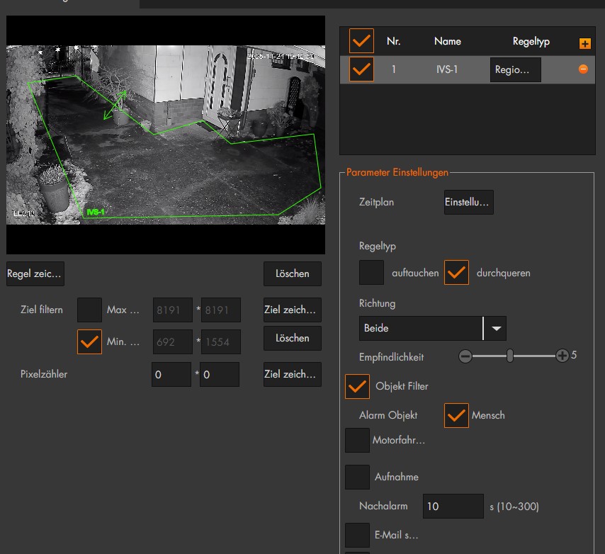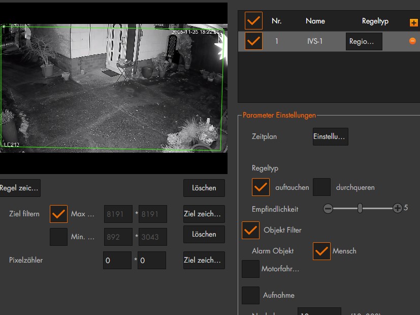 Danke für die Antwort, habe ich jetzt so eingestellt und werde morgen sehen was so passiert. Das mit dem bei Bewegung aufleuchtenden Flutlicht bekommt man nicht weg? Wäre aber das kleinste Problem, mit welchem ich leben kann. Noch eine Frage, auf der Seite der IVS Analyse ist unter Parameter noch einmal ein Kästchen für Aufnahme. Dieses habe ich jetzt nicht angeklickt, da es unter Erkennung schon angeklickt ist. Warum bei beiden Einstellungen diese Auswahlmöglichkeit und worin besteht der Unterschied?