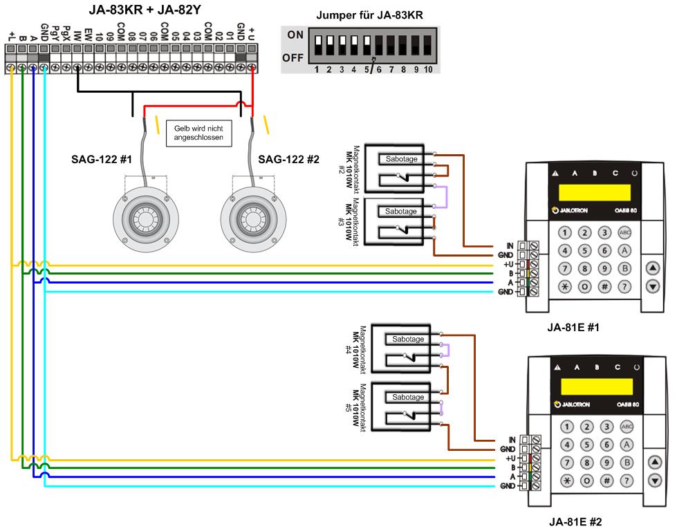 (13-02-2014 16:08)ferris99 schrieb: Mit der Verkabelung (Kabelkanäle legen, löten, ... ) im Keller bin ich einges weiter gekommen, muss aber bzgl. 2 Magnetkontakten die ich an ein JA-81E Pad anschließen wollte wieder zurück an den Start. Die Magnetkontakte #2 bis #5 habe ich nun doch nicht an das JA-81E Bedienteil angeschlossen sondern direkt an die Zentrale an einen eigenen Draht-Linienanschluss (mit jeweils Parallel- und Serienwiderstand - wie im Diagramm bei MK #1 abgebildet). Nur dadurch ist es möglich, diese MK in Zone A zu integrieren. Gesendet von meinem Taschenrechner |