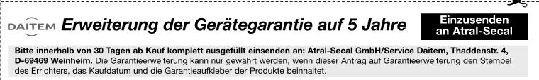 " ....wir bestätigen den Erhalt Ihrer Daitem Garantiekarte und damit die Verlängerung der Gerätegarantie auf 5 Jahre ab Kaufdatum.