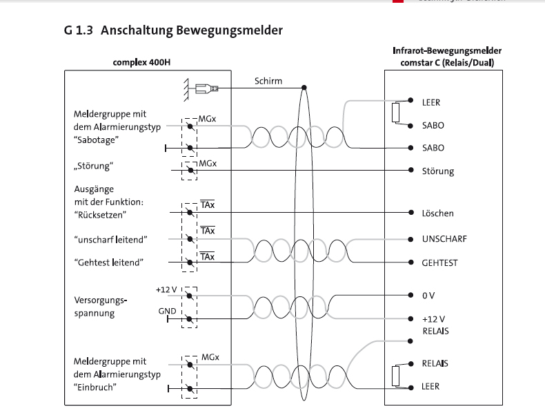 Eigentlich schade, da hast du so ne tolle Alarmanlage mit Meldebus 1 und 2 und musst jetzt so einen Aufwand betreiben um die Bewegungsmelder anzuschließen... Also du musst folgendes tun: Du brauchst eine Meldegruppe für - Sabotage... 2 Drähte - Einbruch... 2 Drähte dann eine Versorgungsspannung - +12V und GND...2 Drähte - Löschen... 1 Draht - Unscharf und Gehtest...2 Drähte Siehe Schaltplan unten: Viel Spaß mit der Glühlampe
