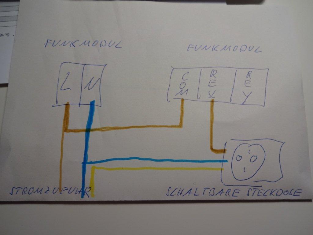 Zitat:als erstes scheint dein x relais nicht richtig angemeldet bzw den richtigen modus zu haben zu sein. es muss die vierte led leuchten ( REAKTION EIN/AUS PG AUSGANG der Zentrale).Danke für den Hinweis, habe es nochmal kontrolliert. Vielleicht haben wir uns falsch verstanden. Angemeldet wurde bei blinkender 4 led über 299 an der Bedienung . Die 2 led leuchtet, wenn ich * 80 bzw. * 81 an der Tastatur eingebe. Habe gerade das x Relais nochmals angelernt. Es geht die 2 led an, wenn ich an der Tastatur die Pg Ausgänge schalte.Zitat:kannst du mal bitte skizzieren oder beschreiben, welches kabel (farbe bzw. L/N/PE) du von deinem wasserwerk genau wo angeschlossen hast.Ok versuche mal meinen Schaltplan hier einzufügen: Zur Erläuterung: Stromzufuhr kommt von Verteiler einer Steckdose. Außenleiter ist bei mir braun. Neutralleiter blau. An das Relais X habe ich eine Steckdose angeschlossen. Diese wurde an COM und REX des Funkrelais angeschlossen. Den Schutzleiter habe ich von dem Verteiler der Steckdose genommen. Ich dachte, dass ich mit der Steckdose flexibler bin, da kann ich ja dann letztlich jeden Verbraucher mit einem Stecker anschliessen. Vorallem da unser HAuswasserwerk schon Zicken macht steht hier bald ein Austausch an... da brauche ich dann nicht neu zu verkabeln....... Zitat: hast du einen spannungsprüfer (welcher typ).Habe bisher mit einfachen Stromprüfer gearbeitet. Zudem habe ich zwecks Kontrolle eine Schreibtischlampe angeschlossen. Leuchtet aber nicht![]() Ich hoffe meine Ausführungen helfen weiter Herzliche Grüße Jurist |