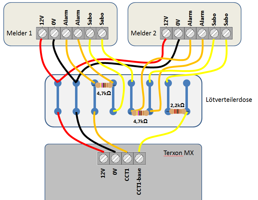 Die Verdrahtung ist nicht korrekt. Du hast parallel zu jedem Alarmkontakt einen 4k7 geschaltet, damit würde der Gesamtwiderstand bei beiden geöffneten Alarmkontakten 2x4k7+2k2=11k6 sein. Du darfst stattdessen nur 1 Stk 4k7 nehmen und dieser muß parallel zu allen in Serie geschaltenen Alarmkontakten sein. Es ist auch immer besser separat alle Sabotagekontakte und alle Alarmkontakte in Reihe zu schalten. Und über die gesamte Kette der Alarmkontakte kommt dann der 4k7. In deiner Verdrahtung kommt immer ein Sabotagekontakt nach einem Alarmkontakt, das solltest du ändern. mfg Sektionschef |