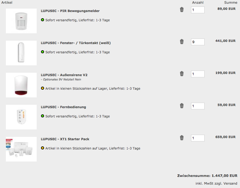 Mit der Lupusec XT1 , 11 Magnetschaltern, 2 BWM , Keypad und Aussensirene