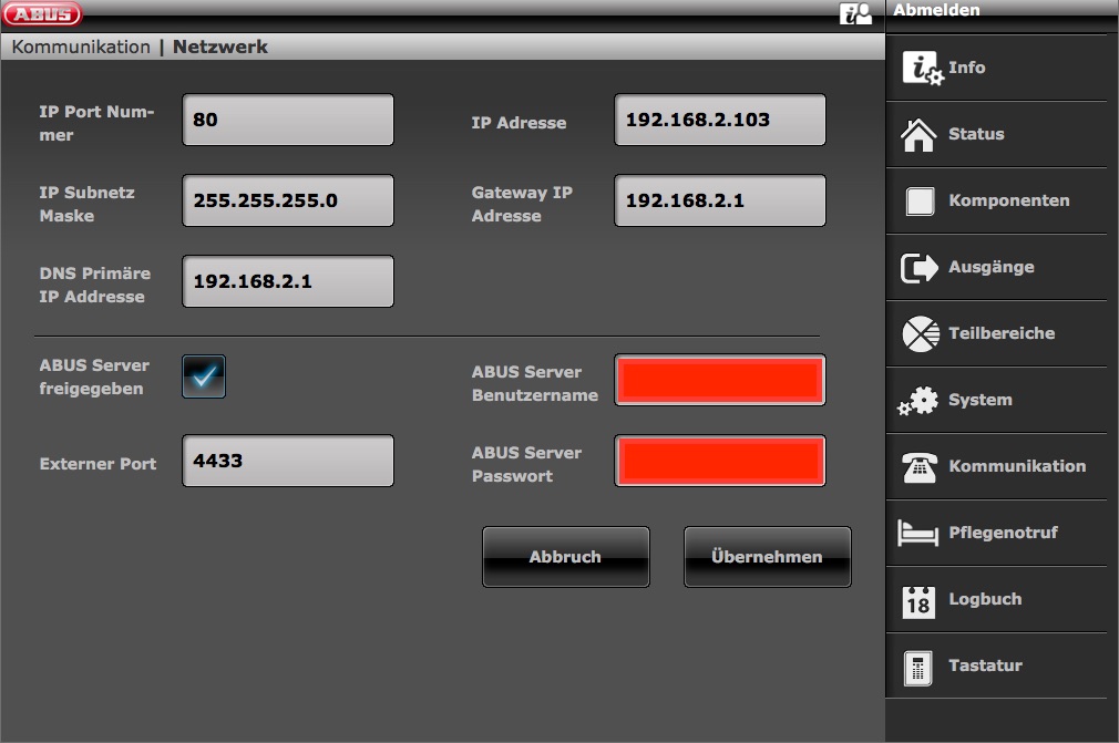 -Abus Server Benutzername und Kennwort in Secvest eingetragen.