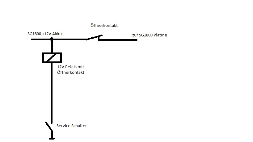 Wenn es OK für dich wäre zumindest ein Relais dafür einzusetzen, dann könntest du diese Schaltung verwenden. Das Relais müsste in die SG1800 eingebaut werden und würde, wenn es anzieht, die Akkuversorgung zur SG1800 Platine unterbrechen. mfg Sektionschef |