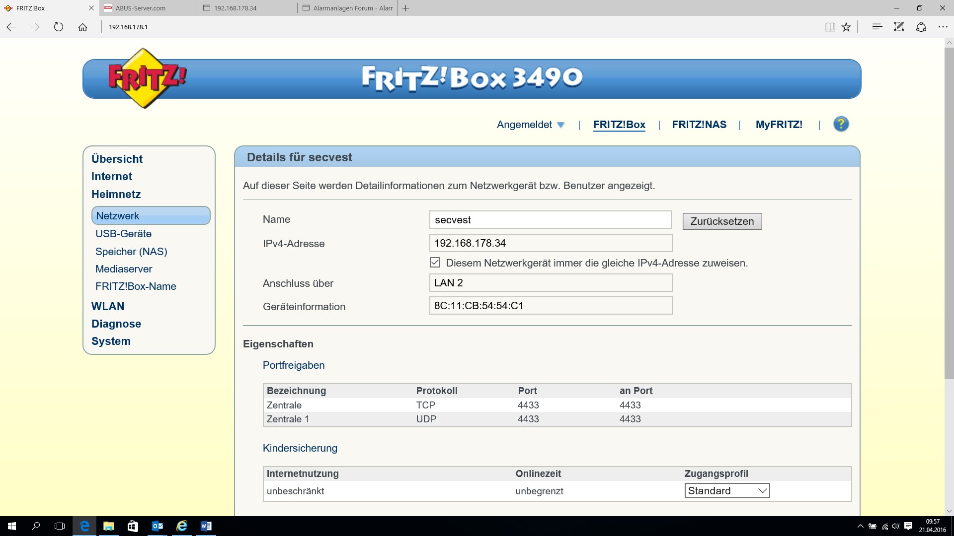 Was mir auffiel ist, dass beim AbusServer eine andere IP aufscheint als die meiner SECVEST (im Heimnetz)