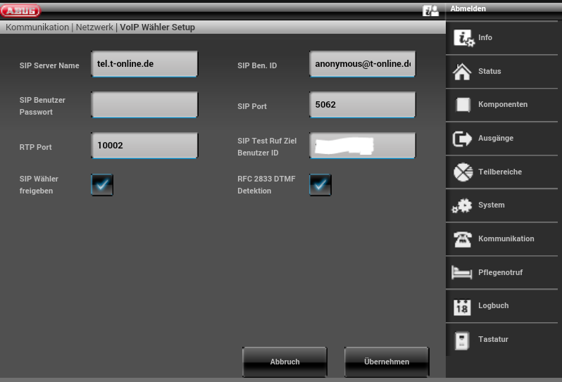 Wenn ja gib in der Abus folgendes ein und mache einen Testanruf: