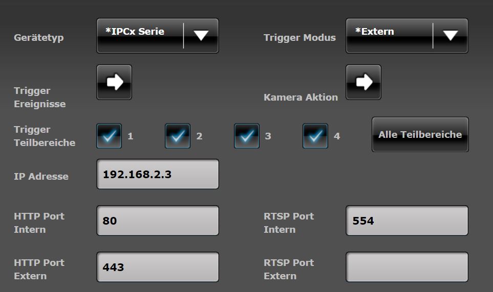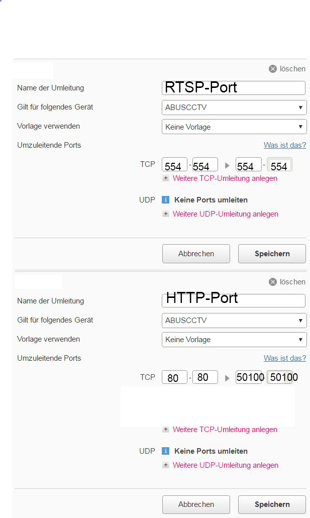 1. Portweiterleitung: (gleich den Namen geben: RTSP-Port): Port 554 bis 554 an Port 554 2. Portweiterleitung: (gleich den Namen geben: HTTP-Port): Port 80 bis 80 an Port extern 50100 Einstellungen in der Secvest: HTTP-Port Extern: 50100 RTSP-Port Extern: 554 Der Rest in der Secvest passt bei dir. |