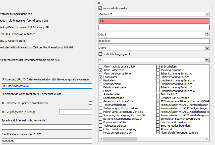 Vielen Dank bis hierher. Jetzt muss ich mir das Menü genau anschauen, was ausgefüllt werden muss. Ich habe "Kommunikation aktiv" geschaltet und als Protokoll "Contact ID" eingegeben. Da ich (noch) keine AES habe, habe ich meine eigene Telefonnummer eingegeben. Die URL für die Bilderübertragung habe ich auf "lib1.jablotron.cz:8086" gestellt. Ich werde morgen einen Alarm provozieren und sehen, ob alles geht. Nach dem speichern der neuen Einstellungen kamen schon die ersten beiden Anrufe von der Anlage - warum muss ich noch verstehen Ich werde berichten. Gruß KH |