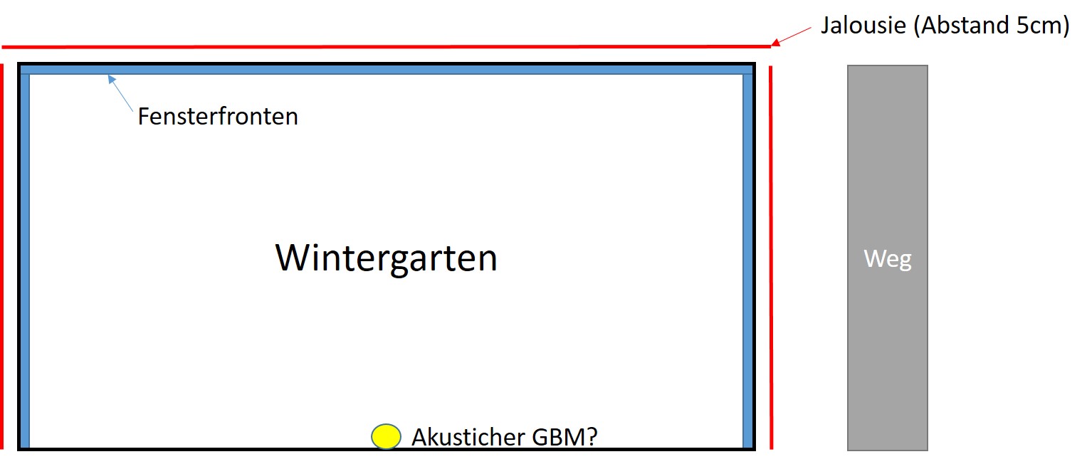 (21-06-2016 22:02)evertech schrieb: 5cm Abstand von wo? Kannst den nicht vor der Jalousie befestigen? Hier mal eine super Skizze ![]() Reicht dieser Abstand überhaupt aus, um dort sinnvoll einen BWM zu setzen? Der Garten ist relativ offen gestaltet, an der Seite (siehe Skizze) führt ein Weg vorbei, der stark von Gassi-Leuten benutzt wird, dort würde dann der BWM ja auch draufschauen?