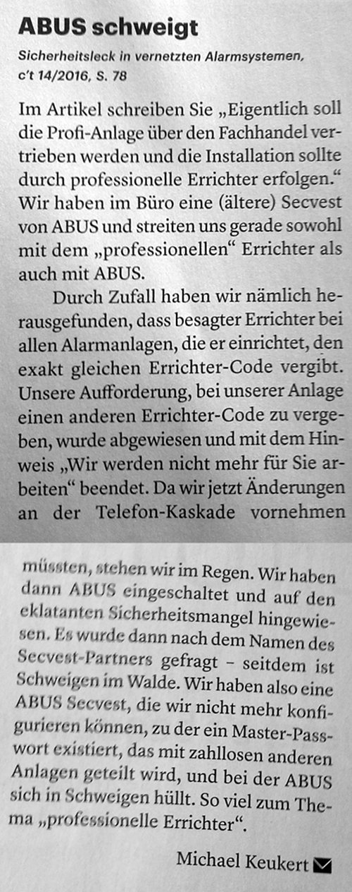 RE: heise.de: "Sicherheitsleck in vernetzten Alarmsystemen"