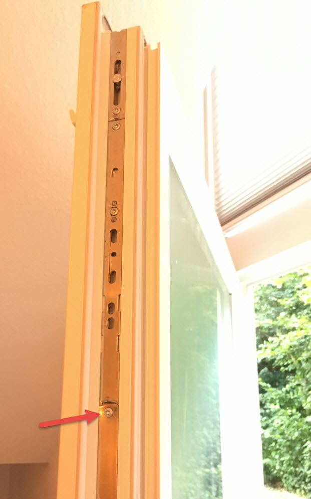 So etwa an einer meiner Terrassentüren. Ich habe nur 2 statt 4 Schrauben verwendet und habe auch nur in den Doppelsteg geschraubt, nicht ins Metall. Die Sabo-Kontakte habe ich vorsichtshalber ausgeschaltet.