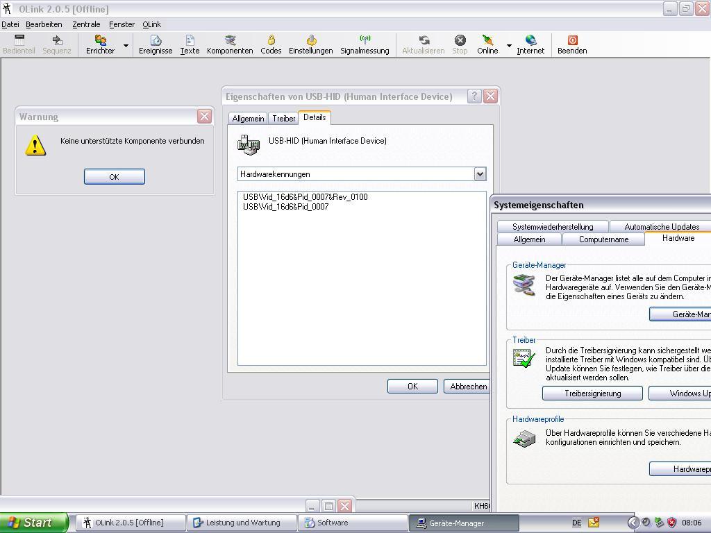sollte die Treibererkennug schon mal ok sein. Denk aber dran, dass ein HID-konformes Gerät alles sein kann. Kriegt man nur raus indem man draufklickt dann bei Details Hardware IDs auswähltund die VID/PID prüft. Hier sollte dann beim 82T folgende Einträge zu sehen sein: VID = VID_16D7 PID = PID_0007 Hier würde ich noch mal das USB-Kabel vom 82T zur Zentrale auf festen Sitz prüfen (oder Kabel wechseln) und auch schauen ob das I.O ist. Ggf. mal den USB Port wechseln nicht das der eine Macke hat. Treiber werden immer pro USB Port installiert und erkannt. Hier auch dem System etwas Zeit geben den zu installieren, das kann schonmal etwas dauern. Bin mir bei Win10 jetzt nicht so sicher, da ich das selber noch nicht hier im Einsatz habe. Aber versuche doch mal die Olink Software als Administrator auszuführen. Rechtsklick und dann als Administrator ausführen. Was bekommst du denn als Meldung angezeigt? Gruß Christian Murphys Law: Man hat niemals Zeit, es richtig zu machen, aber immer Zeit, es noch einmal zu machen. |
