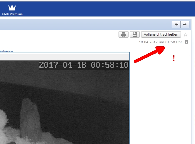 ich habe mir eine Knewmart IPCam zugelegt und überwache damit meinen Außenbereich vorm Haus. Die Kamerazeit, welche rechts oben im Kamerabild angezeigt wird, ist korrekt eingestellt (über das Webinterface der Kamera). Bei Bewegungsmeldung erhalte ich eine E-Mail mit 3 Fotos. Diese Mails wird auf meinen GMail-Account geschickt. Im meinem Posteingang erscheinen die Mails aber seltsamerweise mit der falschen Uhrzeit, nämlich eine Stunde später. Wurde also das Bild um 22 Uhr aufgenommen (was auch in dem Kamerabild dokumentiert ist), trägt die Mail den Zeitstempel von 23 Uhr (obwohl es noch gar nicht so spät ist). Die Uhrzeit an meinem PC ist dabei korrekt eingestellt.
