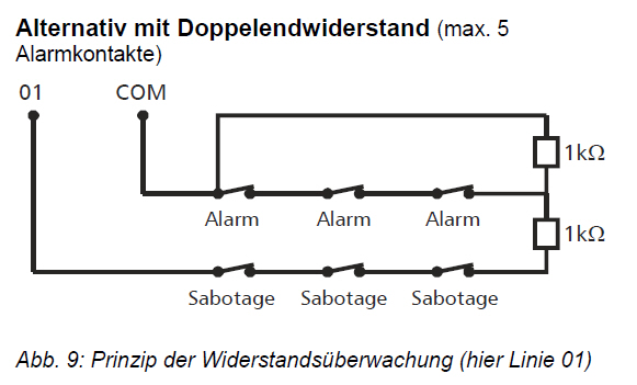 Mein Gedanke mit den 800 Ohm an den 6 Kontakten und 200 Ohm einmal in Reihe war, dass ich dann alle sechs Kontakte gleichzeitg öffnen könnte, ohne ein Problem zu erzeugen, die sechs würden sich auf 4800 addieren plus 200 also 5000. Diese Schaltung hier sieht aber viel einfacher aus... wo ist wohl der Haken? Viele Grüße Emil PS weiß jemand, ob etwas dagegen spricht, die Sirene über das Universalmodul anzusteuern (per Relais, oder ggf mit dem eingebauten relais)? jetzt macht es Klick, vielleicht mache ich es einfach so, dass ich zwei unmittelbar nebeneinander liegenden Kontakte einmal mit einem gemeinsamen 1K Widerstand absichere, dann komme ich auch auf 5. Ihr habt mir sehr geholfen!! zu Deiner Frage, Christian, ja, ich denke, ich habe alle gezählt, könnte noch eine Innensirene mit einer Sabotageleitung absichern, das könnte noch dazu kommen, und wenn ich irgendwann mehr benötige, könnte ich mehrere Panischalter auf eine Linie legen zb. Aber im Moment würde es ja noch passen, gerade so...:-) |