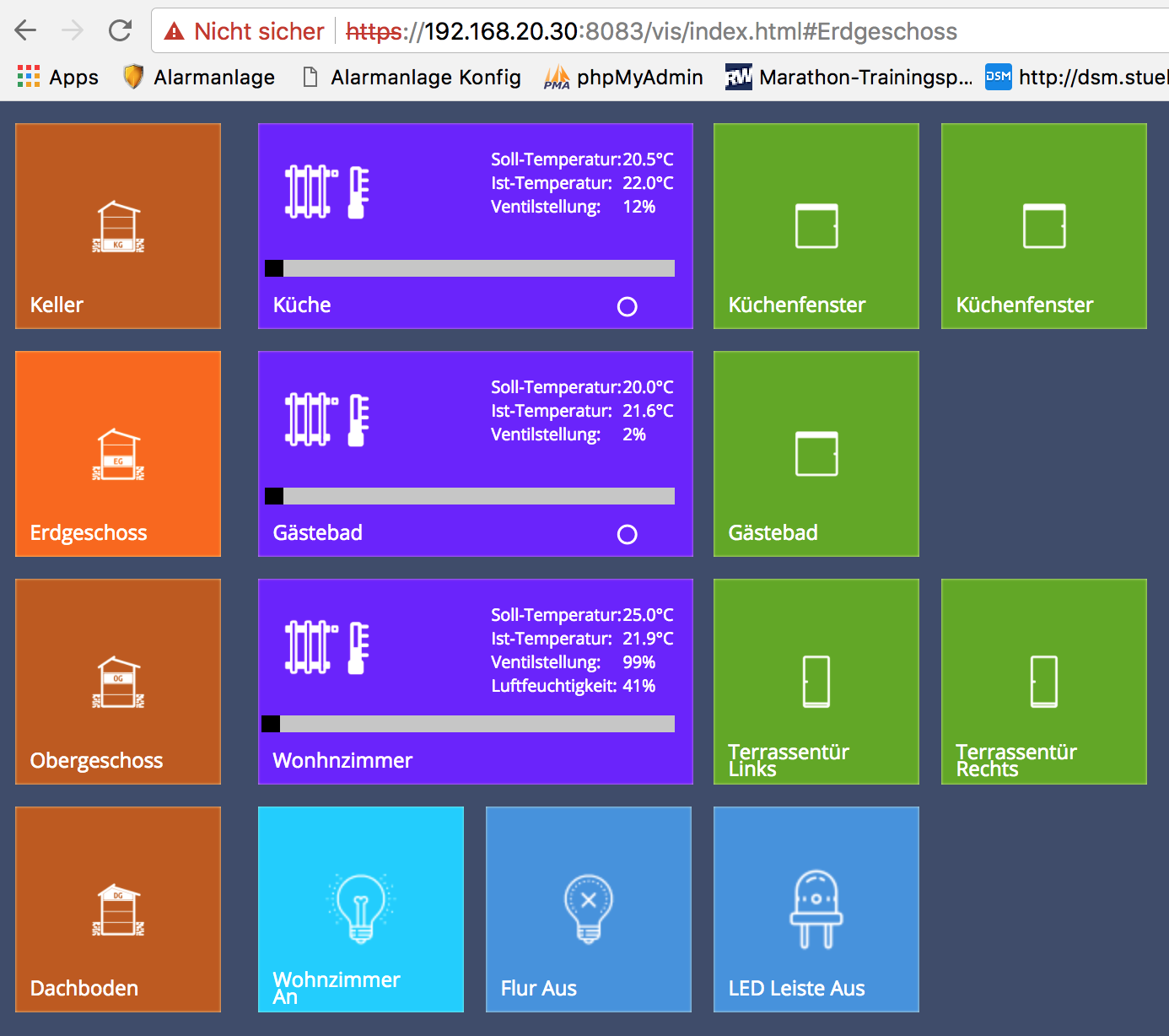(16-11-2017 15:20)6brshooter schrieb: Also bis jetzt habe ich also gesehen, dass die LUPUS Thermostaten i.d.R. nur Probleme bereiten. Ich habe jetzt mir die Heizkörper von Homematic besorgt und diese sowie die Lupusec XT2 in ioBroker eingebunden. Da es noch keinen Lupusec Adapter von ioBroker gibt, braucht man ein wenig JavaScript Programmiererfahrungen um den Status von Lupusec auszulesen. Aber wenn man das geschafft hat, ist die Verbindung über ioBroker total klasse, da man die Lupus Tür-/Fensterkontakte mit den Heizungsthermostaten eines anderen Herstellers koppeln kann. Auch gibt es vom ioBroker eine Verbindung zu Apple Home und Alexa. Damit kann man sich z.B. den Status der Lupus Komponenten anzeigen lassen oder die Lupus Steckdosen schalten. Wenn man möchte kann man auch den Status der Alarmanlage in Apple Home oder Alexa ändern. Ich mache das aber aus Sicherheitsgründen nicht! So sieht es jetzt bei mir aus! Alles Sensoren sind von Lupusec. Die Heizungsthermostaten von Homematic und die Steckosen von Lupusec und welche aus dem Baumarkt! |
