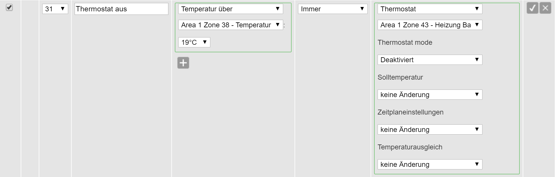 ich suche Hilfe bei der Erstellung einer Regel für die Temperatursteuerung in einem Raum mit einem Raumsensor und zwei Heizkörperthermostaten. Im Ergebnis soll für die Steuerung der Thermostate die gemessene Temperatur am Raumsensor ausschlaggebend sein. Ich möchte gerne erreichen das die Temperatur im Raum mindestens 18°C und max. 18,5°C ist (oder eben gleichbleibend 18°C). Dazu war mein Plan das die Regel bei einer Raumtemperatur unter 18°C, gemessen am Raumsensor, die Heizkörperthermostate anschaltet und bei einer Temperatur über 18,5°C, gemessen am Raumsensor, wieder abschaltet. Leider bekomme ich das selber so nicht hin. Der Support von Lupus hat mich da auch nicht weiter gebracht. Hat jemand von Euch solch eine Regel am laufen bzw. kann mir da jemand behilflich beim erstellen sein. Danke Ingolf |