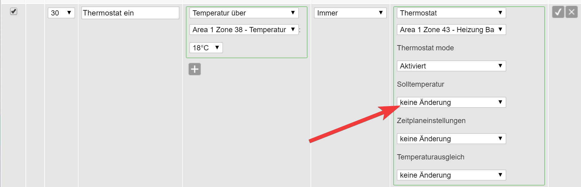 (29-01-2018 13:24)Xaavier schrieb: Dazu war mein Plan das die Regel bei einer Raumtemperatur unter 18°C, gemessen am Raumsensor, die Heizkörperthermostate anschaltet und bei einer Temperatur über 18,5°C, gemessen am Raumsensor, wieder abschaltet. Das ist mit folgenden 2 Regeln realisierbar (siehe Screenshots). Es gibt jedoch 2 Einschränkungen: 1. Du musst beim Aktivieren des Thermostates eine Solltemperatur setzen (auf die der Raum aufgeheizt werden soll) - siehe Pfeil im Screenshot. 2. Der externe Temperatursensor (Raumsensor) kann nur volle Grad erkennen. Du musst also im Wertebereich von 18-19 Grad arbeiten. |