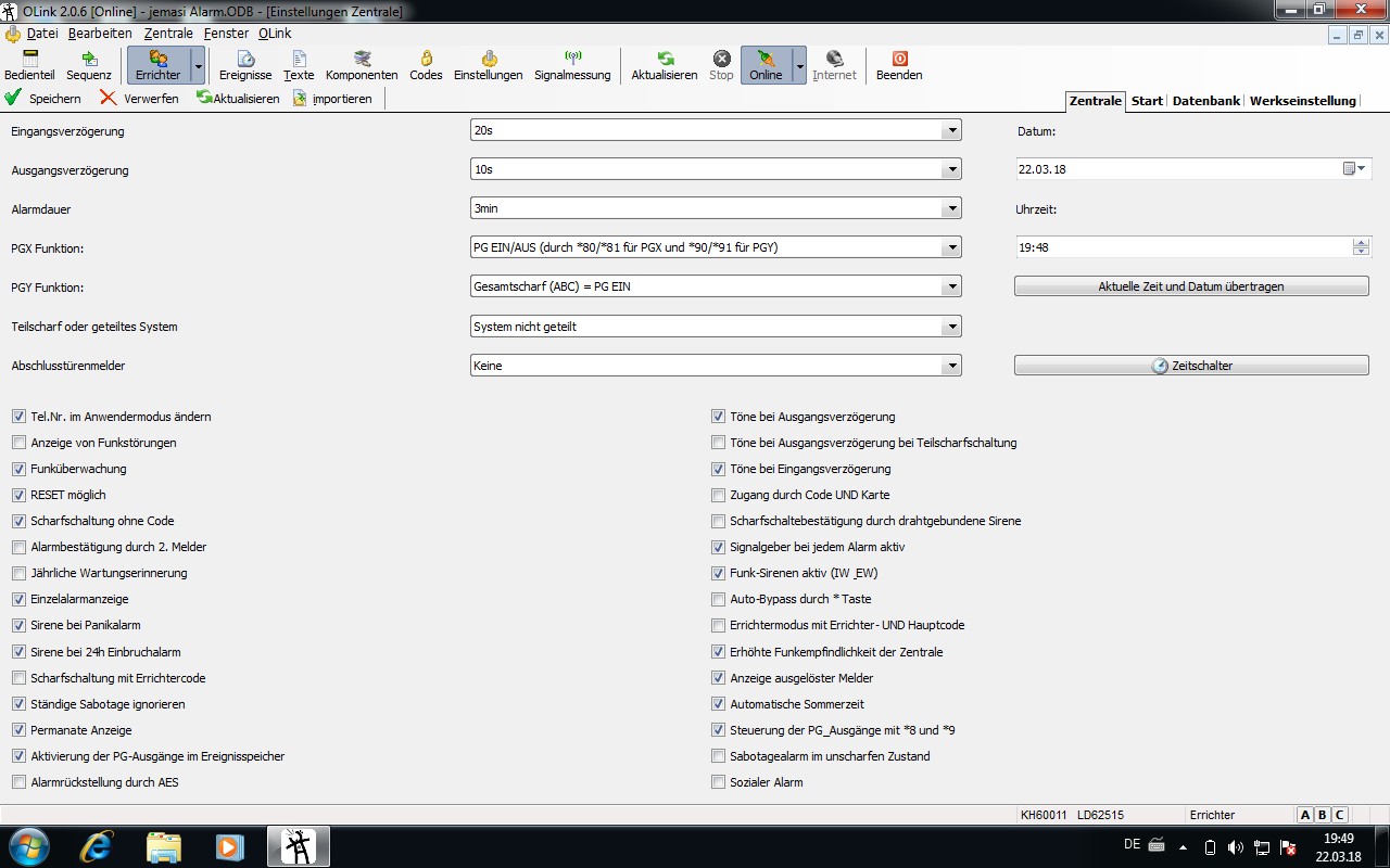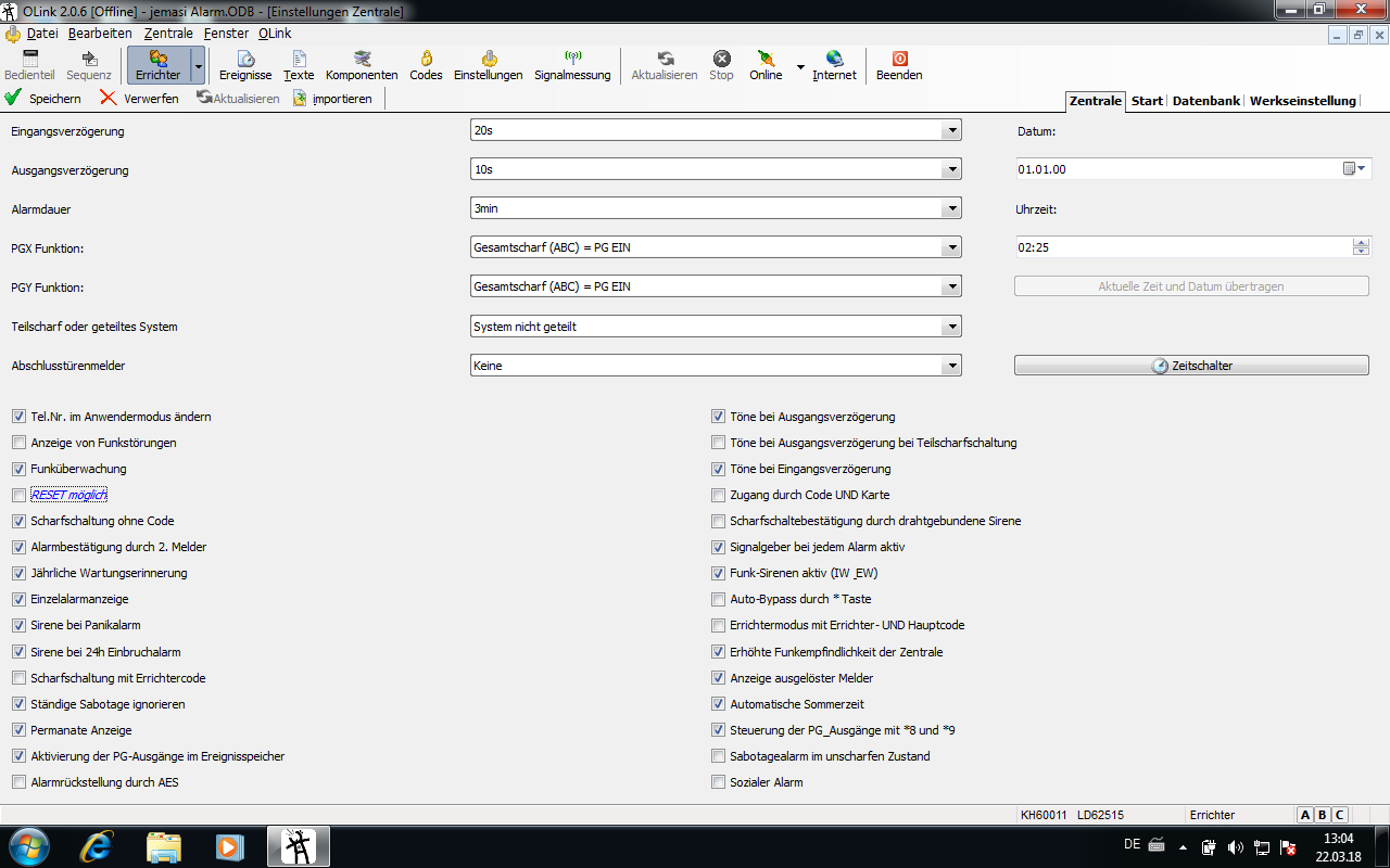 (22-03-2018 20:05)jemasi schrieb: Hallo, Nun du musst dich einmal online mit der Zentrale Verbinden. Mit Online (nicht das Internet) meine ich das eine aktive Verbindung zur Zentrale besteht. Dafür den Button online drücken. Dann ist auch das Feld "aktuelle Zeit und Datum übertragen " aktiv. Hier einmal drücken und die aktuelle PC Zeit wird übertragen. Das musst du normal nur einmal machen. Im Online Modus siehst du dann die aktuelle Uhrzeit die grade eingestellt ist. Die Zeit driftet zwar mit der Zeit etwas aber wenn die Zeit wie im Bild eingestellt wurde oder sehr stark abweicht, wird es dann schwer im Log ggf. was nachzuprüfen wenn mal was ist. Gruß Christian Murphys Law: Man hat niemals Zeit, es richtig zu machen, aber immer Zeit, es noch einmal zu machen. |