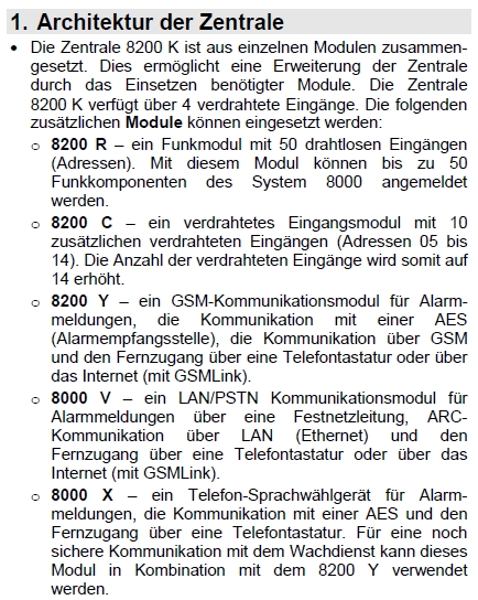 (18-02-2013 00:47)Spaiky schrieb: Alles klar Danke! Merkwürdige Frage, . Für die Frage gibt es aber doch bestimmt einen Grund, den ich jetzt noch nicht erkennen kann?Das ist der Anschluß für den Netztransformator. Genauer für die Sekundärseite (Ausgang) des Trafos. Zitat: Ach ja wenn ich nun zwei verdrahtete Linien an die 8200K anschließe stehen ja nur noch zwei für die Anmeldung der Funkkontakte zur Verfügung. Falsch, Die 8200K ist eine reine 4 Schleifen zentrale für verdrahtete Melder. Wenn du Funk möchtest muss du das Funkmodul 8200R einbauen. Dann kannst du zusätzlich zu den beiden verdrahteten Schleifen noch 48 Funk-Komponenten anschließen. Du kannst die Anlage in max 3 Bereichen einteilen. Einstellungen machst du später über den Programmieradapter und einen Computer, mit der Olink Software. Dann kannst du jeden Melder, jederverdrahtete Eingang verhält sich wie EIN Melder, einem der 3 Bereiche zuordnen. Gruß Tim Ich habe nicht auf jede Frage die passende Antwort, aber zu jeder Antwort die passende Frage. Auch wenn es Wenige ärgert, im Zweifelsfall geht mir Information vor Rechtschreibung. |