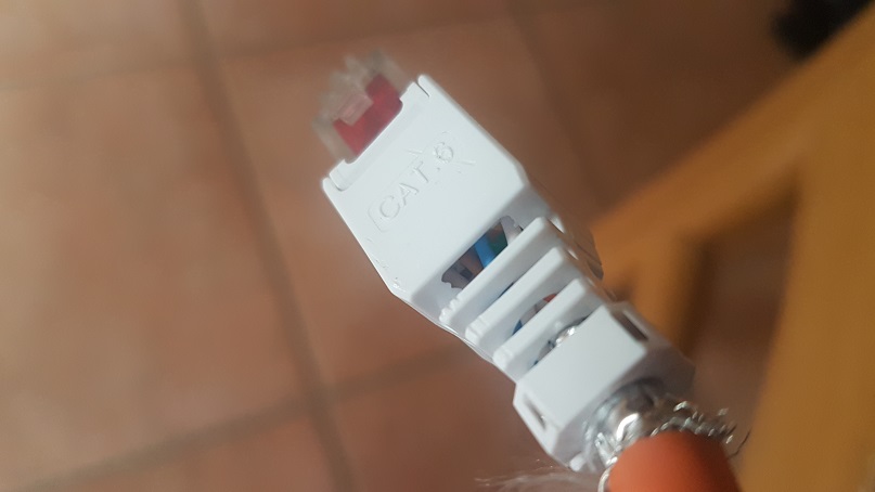 Schön ist Deine Stecker-Anbringung übrigens nicht. Du hast ja gar keine Zugentlastung, die Steckerhülse lappt gar nicht über die Kabel-Isolierung. Mir scheint der Durchmesser der Kabeleinführung des Steckers für das dickere Cat7-Kabel zu gering sein. Professionellerweise wird so etwas mit einer Crimper-Zange fest vercrimpt.