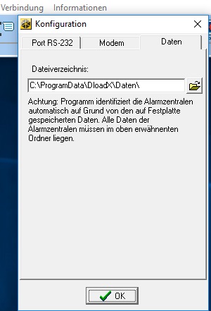 Dort steht auch noch ein Warnhinweis, dass die Identifizierung von DLOADX an der Zentrale nur gelingt, wenn die Daten der Zentrale im angegebenen Ordner liegen.