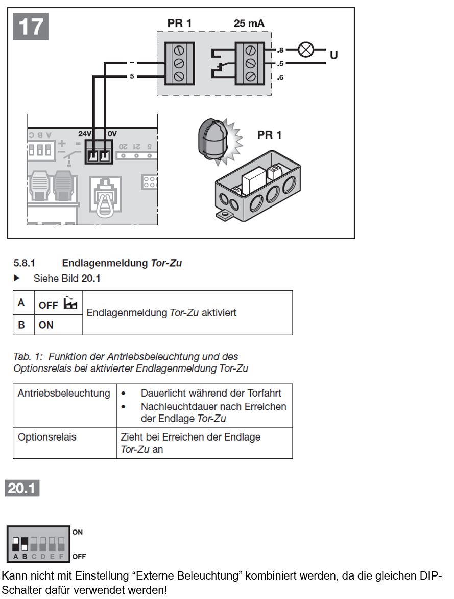 Jawoll, die Erklärung passt! Die Nachleuchtfunktion gilt nur für die eingebaute Lampe. "Tor zu" bleibt stehen solange das Tor eben zu ist. Steht auch in der Tabelle unten in meinem angehängten Schaltbild.