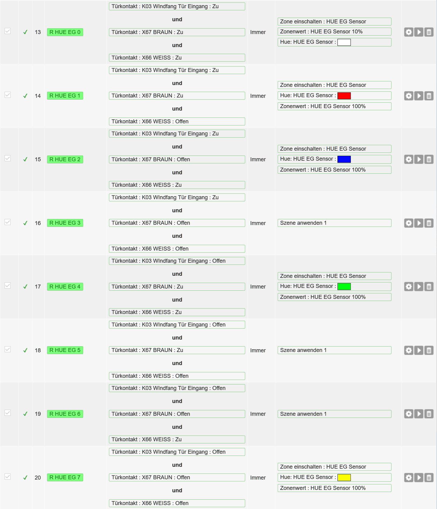 Hab's mit 3 Kontakte und 8 Regeln getestet ---> funktioniert. (Anhang) Was ich gelernt habe: Die HUE-Lampen übernehmen die Farbwerte und Intensitätswerte nur dann, wenn VORHER die HUE-Lampe (Zone) eingeschaltet worden ist. Deshalb nun die entsprechende Reihenfolge der Aktionen in den Regeln. Naiverweise bin ich ursprünglich davon ausgegangen, dass die Aktionsreihenfolge egal ist, da die HUE-Lampe ja sowieso auch im Aus-Zustand auf Befehle wartet. Aber offensichtlich wird im AUS-Zustand nur der EIN-Befahl verarbeitet, andere Befehle aber nicht. Kann dieses HUE-Lampen-Verhalten jemand bestätigen?