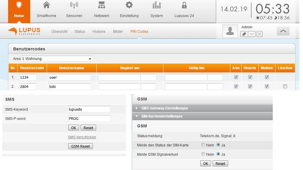 Das SMS-Keywort steht auf "test" und ein Pin ist wie gewünscht an der passenden Stelle nach beschreibung angelegt. "1234"; der Benutzer dazu ist "user". Das war schon so voreingestellt.