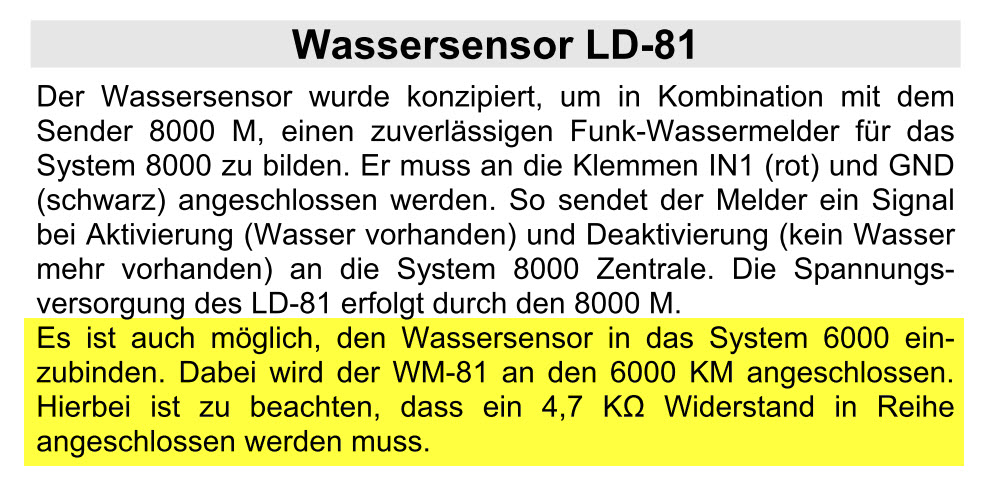 auch ich versuche verzweifelt den Wassermelder LD-81 direkt an der Zentrale anzuschließen. Laut Anleitung soll es gehen, aber wenn ich das rote und schwarze Kabel des Melders verwende (gelb und blau unbenutzt), erhalte ich sofort einen Alarm. Der Anschluss erfolgt an COM und Eingang 1. Den Widerstand habe ich wie in der Anleitung genannt eingeschleift. Laut Anleitung müsste es gehen, siehe Anlage. Ist das ein Fehler und es wird zwingend der LD-12 benötigt? Gruß Thomas |