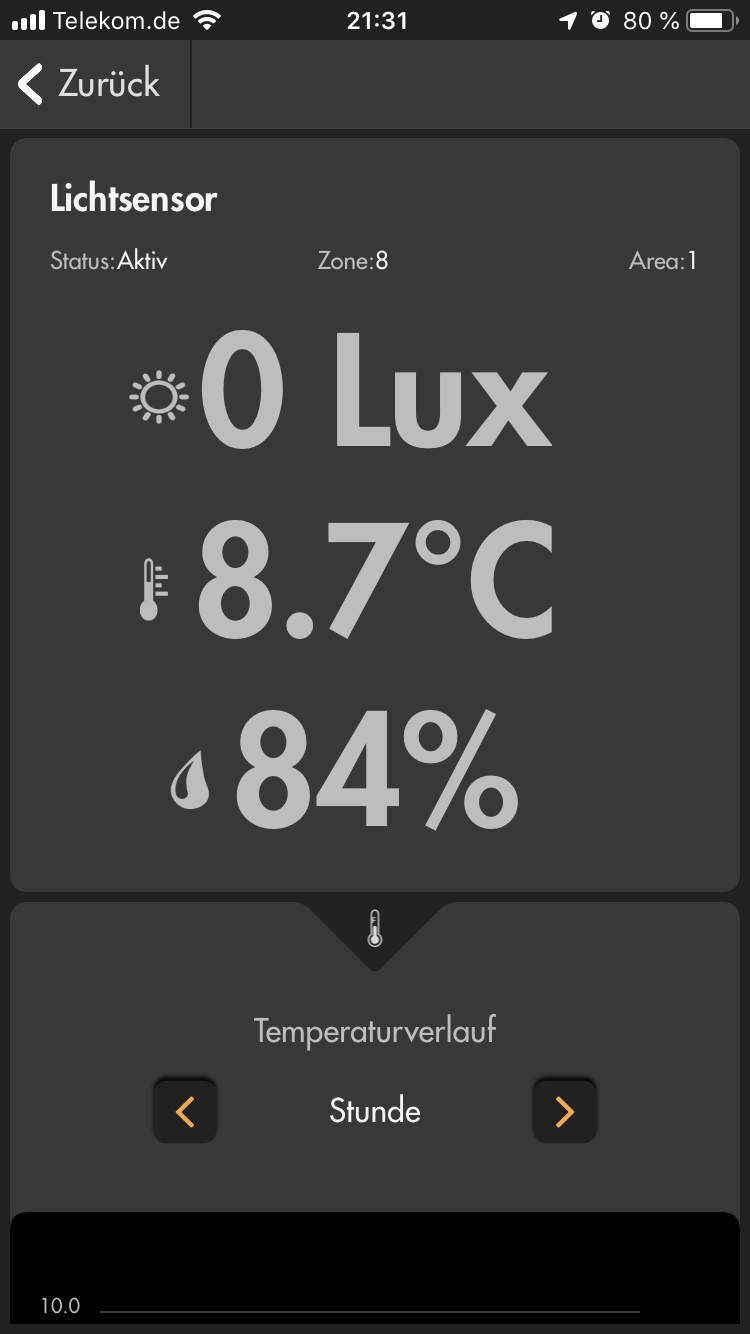 Auch das aktuelle Handbuch ist hier noch nicht ganz angepasst worden. Die Tabelle geht von LUX-Level 0 bis 16, aber die neuen Lichtsensoren V2 dürften aktuell wohl von LUX-Level 0 bis 20 gehen, die Tabelle im Handbuch endet aber derzeit noch bei Level 16. Leider kann ich das mit der Minusgrade Anzeige derzeit nicht Testen da es bei direkter Sonneneinstrahlung auf der Südseite jetzt schon über 30°C hat: Ebenso ist bei mir auf der Oberfläche vom Android Handy der Verlauf vom Lichtsensor schön zu sehen, inklusive Helligkeit, darunter Temperatur und darunter dann Luftfeuchtigkeit. Leider sehe ich dies am PC nicht. In der PC APP 0.0.3.0 findet sich zwar links unter dem Haussymbol (Smarthome) der Menübpunkt Temperaturverlauf, hier sehe ich aber im Moment nur mein altes Thermometer und hier auch nur die Temperatur ohne Luftfeuchtigkeit. Die Daten vom Lichtsensor scheinen hier noch nicht auf. Eventuell wird ja der Menüpunkt "Luftfeuchtigkeit" und die Anzeige von den Lichtsensorwerten später noch bei einem PC APP Update nachgereicht. Auf dem Android handy mit der Lupusec APP funktioniert es ja bereits jetzt schon einwandfrei: siehe auch die Bilder von striegel26 im Startbeitrag#1 wäre schön wenn das später auch in der PC APP zur Verfügung steht. Ansonsten bin ich mit dem neuen Lichtsensor sehr zufrieden, läuft einwandfrei bisher und liefert zuverlässig seine Daten. Anmerkung: Falls sich jemand den neuen Lichtsensor zulegt, bitte Geduld haben! Gleich zu Beginn, nach dem unmittelbaren Anlernen vom neuen Lichtsensor zeigt dieser vorerst nur die Helligkeit mittels LUX-Level an, erst nach über 30 Minuten wurden dann auch Temperatur und Luftfeuchtigkeit zusätzlich angezeigt. |