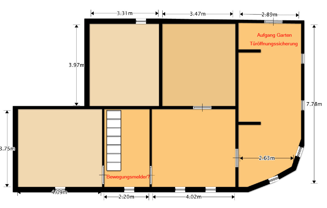 wir haben uns ein altes freistehendes Haus gekauft was bald kernsaniert wird, hierbei wird auch die komplette Elektrik, und alle Fenster und die Eingangstür und Terassentür ausgetauscht. Da wohl in der Vergangenheit einmal eingebrochen wurde, wurden schon diverse Maßnahmen wie Fenstergitter und Riegel vor der Kellertür angebracht. Der Gartenbereich ist von Nachbarn schlecht einzusehen und Böse Buben könnten hier wohl ungestört werkeln. Wir möchten aber neben Einbruchshemmmenden Fenster und Türen eine Anlage einbauen, wir benötigen die nicht für die Versicherung. Wir haben auch eher wenig Bargeld oder Schmuck im Hause. Ich habe hier schon relativ viel gelesen, frage mich aber trotzdem was hier die richtige Anlage für uns wäre. Folgendes habe ich mir bisher gedacht: Nachts Aussenhautsicherung, wenn wir weg sind alles. Magnetkontakte und Glasbruchüberwachung an bewegliche Fenster-oder Türflügel Nur Glasbruchüberwachung an festen Flügeln Hausflur, Kellerflur und Wohnzimmer, Dual Bewegungsmelder Im Obergeschoss würde ich nur zwei Fenster überwachen, die über das Flachdach erreicht werden können. Hier würde ich einen Bewegungsmelder im Flur positionieren Luke zum Dachboden würde ich ebenfalls nicht sichern da Bewegungsmelder im Obergeschoss Sperrelemt für Haustür wäre schön, ist aber eine Frage des Preisen ![]() Ich habe auch an ein GSM Modul zur Benachrichtigung gedacht, besonders schön wären natürlich Kameras? Außen Sirene benötige ich allein schon wegen der Abschreckung (Nachbar hat auch eine, und ich möchte nicht das Haus haben bei dem eingebrochen wird, weil keine da ist) Ein weiterer Plan ist es, Rauchmelder (Draht?) im Haus zu verteilen, wenn der Preisunterschied nicht zu groß ist, wäre es schön das in die Anlage einbinden zu können. Wichtig ist, das möglichst keine Fehlalarme erzeugt werden und die Handhabung einfach ist (für meine Frau natürlich ![]() Eine hybride Anlage würde ich bevorzugen damit man die Kabel bei dem Glasbruchmelder nicht sieht (wenn es aber nicht sinnvoll ist würde ich darauf auch verzichten) Ich werde natürlich noch einen Termin für ein Angebot machen lassen. Ich habe im Bekanntenkreis, niemanden der mir einen Anlagenbauer empfehlen kann, woran erkenne ich einen guten? Oder könnt ihr mir jemanden im südlichen Ruhrgebiet wie Bochum und Essen per PN empfehlen? Unser Budget hierfür liegt bei 3.000-4.000 Euro, würde das bei den Anforderungen passen? Als Anlage habe ich mal ein Grundriss mit meinen Plänen eingefügt, vielleicht hilft es mir dem Analgenbauer schon zu sagen was wir uns so vorgestellt haben. Gruß Gruß |