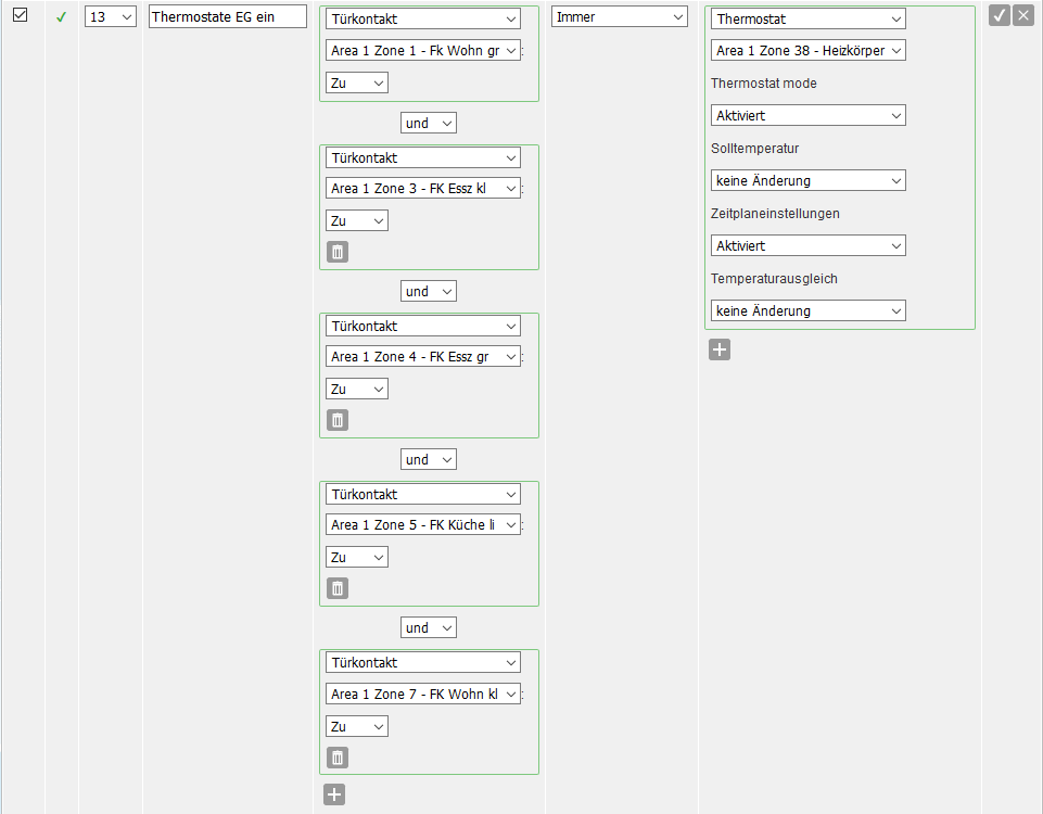 Zeitplan habe ich beim Thermostat hinterlegt und immer wenn ein Fenster z.B. im EG aufgeht, dann sollen dort die Heizkörper ausgehen. Rechts kann man dann alle betroffenen Thermostate aufführen und wenn die Fenster zu sind gehen die Thermostate automatisch wieder in ihren Zeitplan. Oder habe ich da einen Denkfehler? XT2 Plus 1x Außen-, 1x Innensirene, 1x Hutschienenaktor, 1x Keypad V2, 3x BWM V2, 15x Türkontakt V2, 1x Lupus Funksteckd., 9x Rauchmelder V2, 12x Rolladenrelais V2, 13x Heizkörperthermostat V2, 2x Temp.sensor, 9x Shelly, 2x Statusleuchte mit ESP32, 6x Zigbee Steckd. | IO-Broker |
