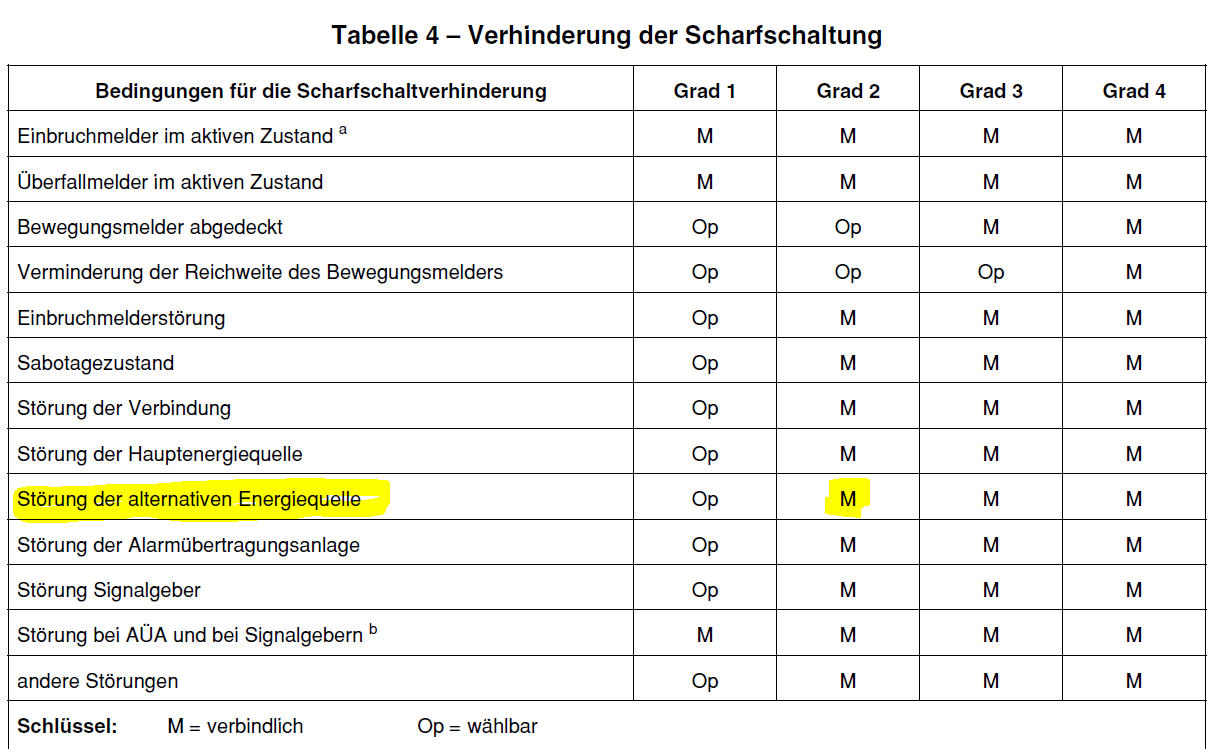 Zitat:Als Beispiel ein Ladengeschäft, welches um 21:00 Scharf schalten will und nun tritt die Akkustörung auf - unscharf lassen wäre sicher keine OptionDann muss der Betreiber den Wartungsdienst rufen und warten. Scharfschalten ohne Akku ist nicht zulässig. Die Grundkonfiguration der Anlage entspricht den VdS-Richtlinien und da verhindert eine Akkustörung die Scharfschaltung. In der EN aber auch. Ich habe gerade einfach mal eine leere Konfiguration in CompasX für eine 200H aufgemacht. Akkustörung ist vom AT Störung und Störung ist für ext. Scharf in der Zwangsläufigkeit. Siehe Bild: PS: Hier ein Auszug aus der DIN EN. Hab Grad 2 markiert, weil die Complex 200H diese Anerkennung besitzt. VdS muss das auch einhalten. |